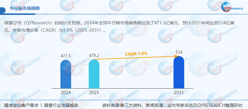根據(jù)QYResearch的統(tǒng)計(jì)及預(yù)測(cè),2024年全球牛仔褲市場(chǎng)銷(xiāo)售額達(dá)到了471.5億美元,預(yù)計(jì)2031年將達(dá)到534億美元,年復(fù)合增長(zhǎng)率(CAGR)為1.8%(2025-2031)。地區(qū)層面來(lái)看,中國(guó)市場(chǎng)在過(guò)去幾年變化較快,2024年市場(chǎng)規(guī)模為116億美元,約占全球的24%,預(yù)計(jì)2031年將達(dá)到190億美元,屆時(shí)全球占比將達(dá)到35%。